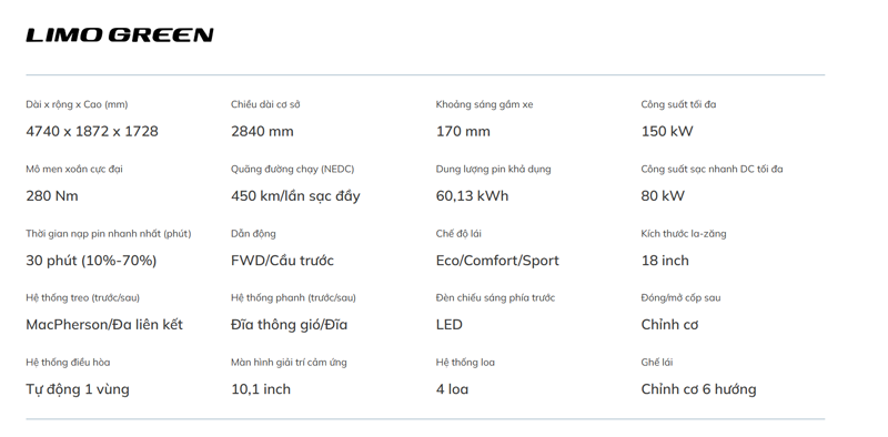 THÔNG SỐ KỸ THUẬT VINFAST LIMO GREEN 2025